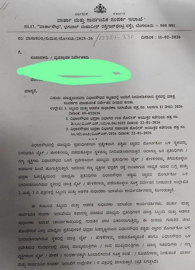 ವಿಧಾನಸೌಧದಲ್ಲಿ ಮಾಧ್ಯಮ ಪ್ರತಿನಿಧಿಗಳ ಕಾರ್ಯವ್ಯಾಪ್ತಿಯನ್ನು ನಿರ್ಬಂಧಿಸುವ ಕುರಿತು ವಾರ್ತಾ ಇಲಾಖೆಗೆ ಸರ್ಕಾರ ಪತ್ರ ಬರೆದಿದೆ. ಪತ್ರದಲ್ಲಿ, ಮಾಧ್ಯಮಗಳು ರಾಜಕೀಯ ನಾಯಕರ ಪ್ರತಿಕ್ರಿಯೆಗಳನ್ನು (News byte) ಪೋರ್ಟಿಕೋ ಅಥವಾ ಕೆಂಗಲ್ ಗೇಟ್ ಬಳಿಯ ನಿಗದಿತ ಸ್ಥಳದಲ್ಲಿ ಮಾತ್ರ ತೆಗೆದುಕೊಳ್ಳಬೇಕು.