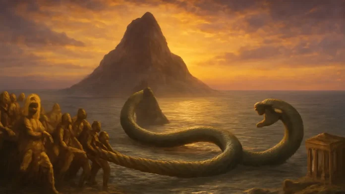 Gods and demons unite to churn the Ocean of Milk using Mount Mandara and the serpent Vasuki, seeking the nectar of immortality